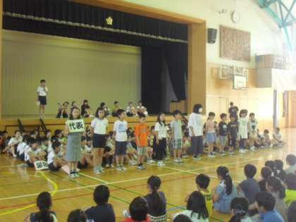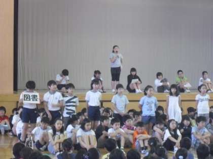 今朝の児童集会は、4月から活動が始まっている前期の各委員会の委員長が舞台に上がり、今年度の活動の紹介とめあてなどの発表する集会です。委員長以外の5・6年生は全員舞台の前に整列し、4年生以下の児童と向き合って行われました。学校のために働いてくれる5、6年生の発表を聞いて、下級生は上級生にあこがれるものです。高学年の皆さんは、さらに気を引き締めて、前期の各委員会の仕事に全力で取り組んでくださいね。よろしくお願いします。