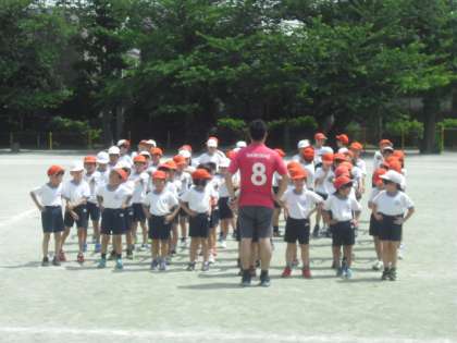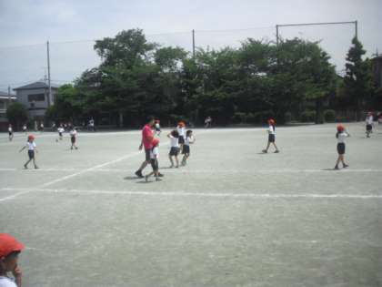 2時間目、1組と2組での合同体育が、校庭で行われました。2クラスの子どもたちが、楽しく身体を動かして交流が図れるように、ルールを決めて楽しく校庭を走り回りました。先生の号令・指示に従って整列することもでき、気持ちのよい汗を流していました。