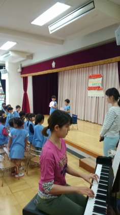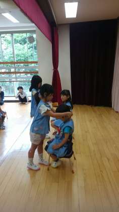 年長組さんからペンダントをもらいました。皆からは、歌のプレゼントでお祝いをしました。二人のお友達も、にこにこ嬉しそうでした。