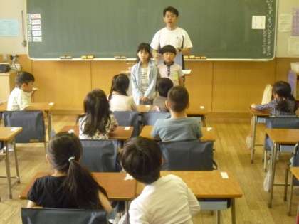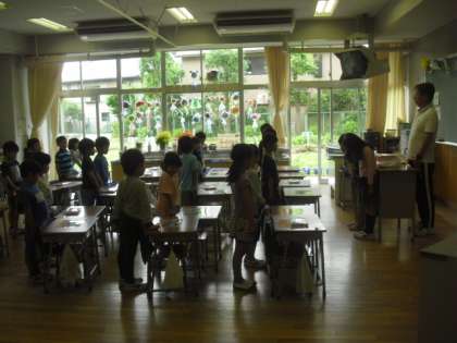 楽しい集会が終わり、気持ちを切り替えて教室での授業に入ります。1年生の教室でも、1時間目の前に、朝の会が行われていました。日直の子どもたちが前に出て、号令をかけます。まだ上手にはできませんが、順番で何回も繰り返していくうちに、スムーズにできるようになるでしょう。さぁ、今日も1日がんばりましょう。