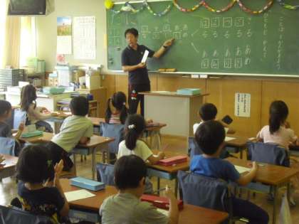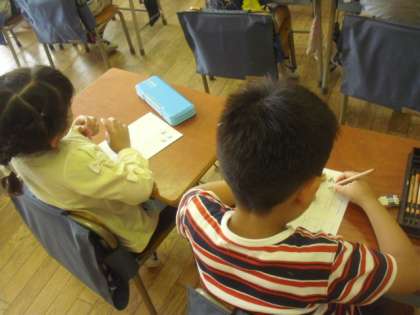 1組の3校時は、国語の授業です。「ひともじ かえて」の単元で、ルールに従って言葉集めをする課題に取り組みました。ひらがなを一文字変えることで、言葉が別の意味に変わることを理解します。子どもたちは、言葉のつながりを楽しみながら、一生懸命考えてワークシートに書き込んでいました。考えた言葉を、みんなの前で発表することもできました。