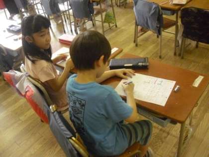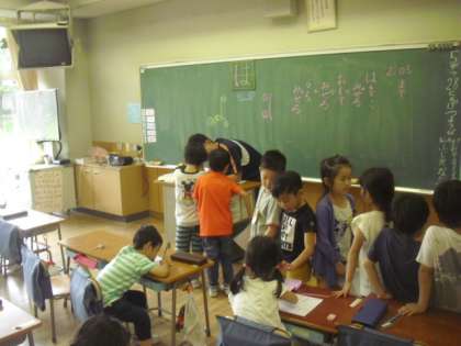 1年生は、ひらがなの勉強が終わろうとしています。今日もワークシートを使って、一生懸命に練習し、一人一人先生に見てもらっていました。集中してていねいに練習している様子から、1年生のやる気が感じられました。