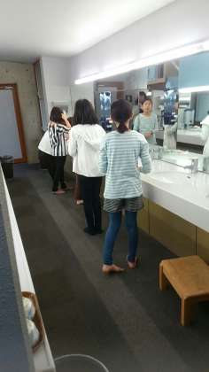 朝の検温の報告と洗顔です。具合の悪い子は、いないようです。