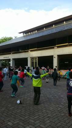 朝の朝会とラジオ体操は、宿舎の前の広場で行いました。晴れて気持ちのいい朝です。今日も1日頑張りましょう。