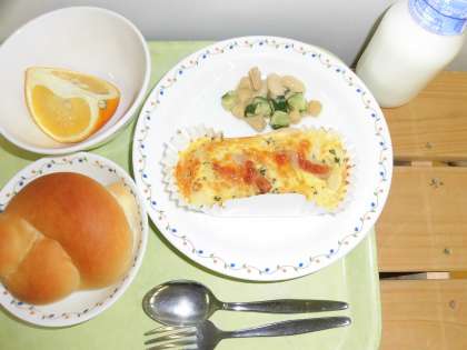 「ミルクパン、フレンチエッグ、ビーンズサラダ、甘夏みかん、牛乳」です。