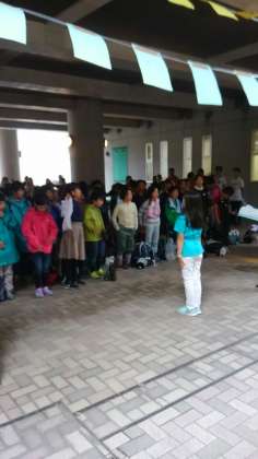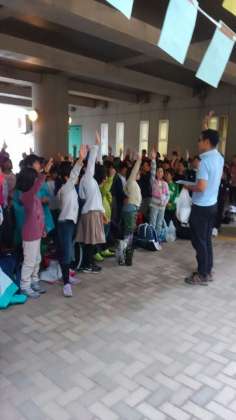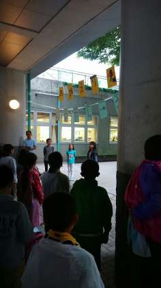 川場移動教室の帰校式です。6年生の「おかえりなさい。おつカレーさま」のメッセージの下で、行いました。