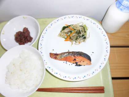 「ごはん、鮭の南部焼き、野菜の辛子醤油かけ、煮豆、牛乳」です。