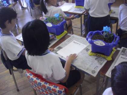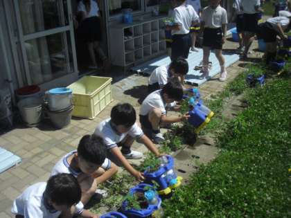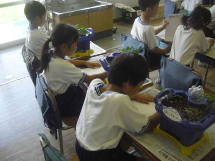 3組の1時間目は、生活科「めざせ、野菜作り名人」の授業で、育ていてるミニトマトの世話と観察を行いました。みんな、毎日しっかり水やりをしているので、苗はぐんぐん生長しています。早く真っ赤な実が育つように、これからも一生懸命お世話してくださいね。