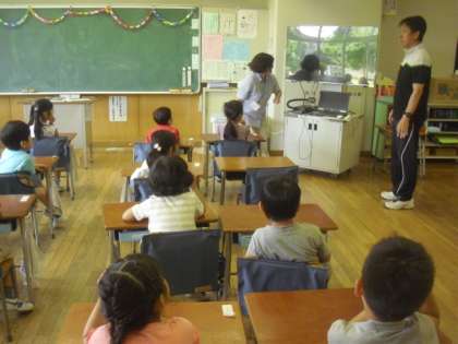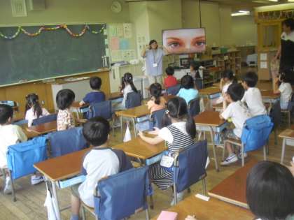 1組の1時間目は外国語活動です。担任の塚越先生と外国人講師のアグネス先生が、楽しく子どもたちに英語を教えます。モニター使った映像クイズで、身体のいろいろな部位の言い方を学びました。アグネスの発音に続き、みんな元気に繰り返していて、楽しく英語に親しむ様子が見られました。