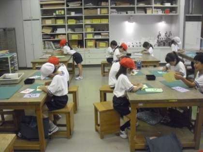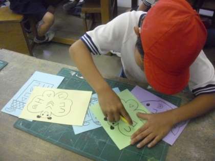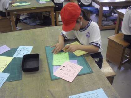 2年生は図工の時間で、カッターの使い方を教わって練習しました。安全に手を添えながら、練習用の色画用紙の模様に切り込みを入れていきます。直線だけでなく、曲線のついても練習しました。難しい作業にも、子どもたちは意欲的に、楽しく課題に取り組んでいました。