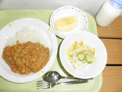 「キーマカレーライス、野菜の甘酢かけ、王林りんご、牛乳」です。