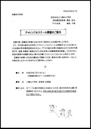 学校運営委員会が主催する、平成30年度の「チャレンジ☆スクール」の申し込みの締め切りが、いよいよ明日14日(木)までとなりました。まだのご家庭がありましたら、再度ご検討いただきまして、それぞれの担任までご提出ください。夏休みの思い出作りに、たくさんの子どもたちの参加をお待ちしています。