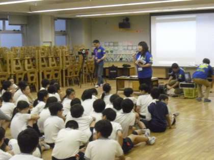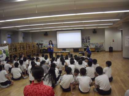 オリンピアンの講演の後は、午前中に制作した応援ムービーの上映会です。どんな仕上がりになったか、楽しみな様子です。星選手もいっしょに観ていただきます。