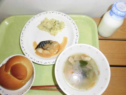 「明日葉パン、鯖のマリナード焼き、パセリポテト、ベーコンと野菜のスープ、牛乳」です。