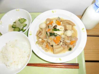 「ごはん、すき焼き煮、大根ときゅうりのごま風味、牛乳」です。