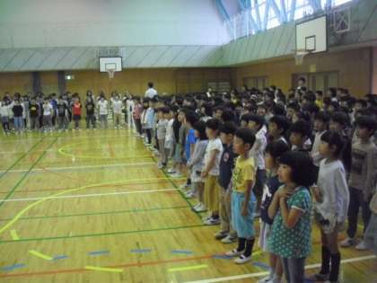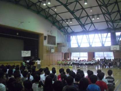 今月の音楽朝会の課題曲は、「ゆかいに歩けば」です。リズムにのって歌うことをめあてに、笑顔を絶やさずに歌いました。外は今日も雨ですが、この歌のように、愉快に1日過ごしましょう。