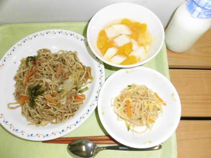 「ソース焼きそば、もやしのコチュジャン、杏仁豆腐、牛乳」です。