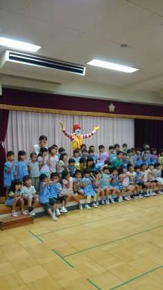 マクドナルドのキャラクターのドナルドさんが、交通安全のルールや食育について、楽しくお話をしてくれました。最後に、記念撮影をしてお別れしました。