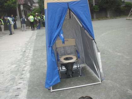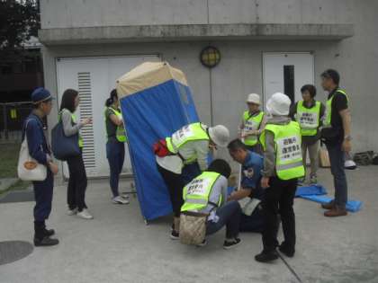 救護・衛星担当のコーナーでは、仮説トイレの設営を行いました。防災倉庫の前のマンホールを利用してトイレを設置したり、下水マンホールの確認をしたりしました。トイレ用のテントの組み立てや、マンホールの開け方などを体験し、トイレの使い勝手を自分の目で見て確かめました。また、震災対策用井戸や排水機能等についても、実際に使ってみて確認しました。