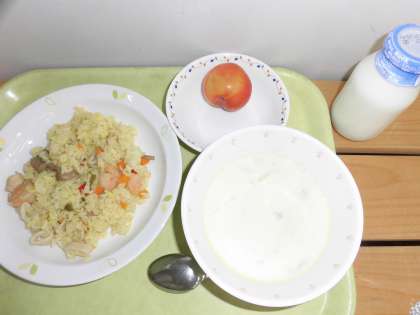 「パエリア、ポテトスープ、プラム、牛乳」」です。