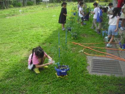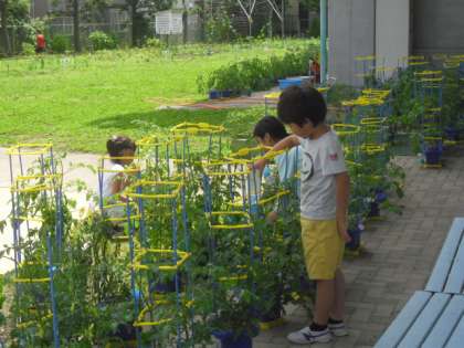 2年生のミニトマトのお世話が忙しいです。今週に入ってお天気が続き、水やりが追いつかない状況です。朝に昼にと水をあげ、さらに伸びた葉の間引きをするなど、お世話に余念がありません。小さな実もつき始め、さらに楽しみが増えましたね。