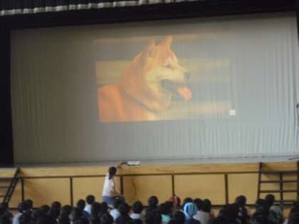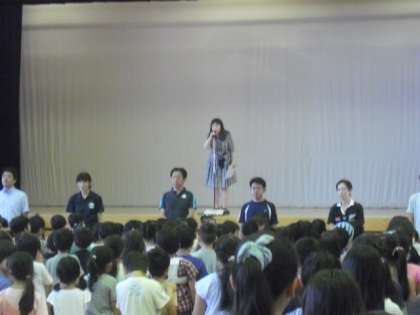 7月に入って最初の全校朝会。校長先生からは、交通安全についてのお話から、八幡山駐在所の武藤巡査長が推薦する本の紹介がありました。また、今日から2年生に新しいお友達が加わり、全校児童への紹介がありました。