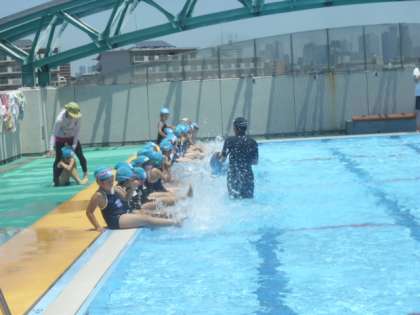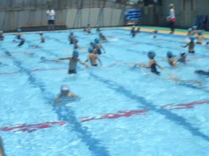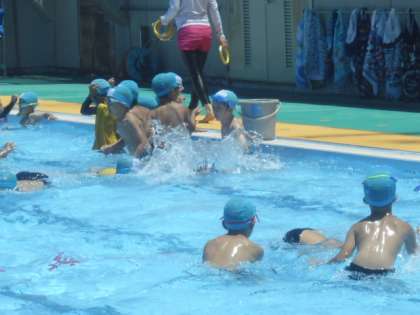 夏のような日差しの下、3・4校時は、1年生で水泳指導が行われました。今年の1年生は、水を怖がる子が少なく、みんなとても楽しそうです。今日も宝探しの活動では、我先に水の中に潜って、宝を探していました。