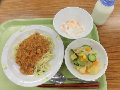 「ジャージャン麺、ポテト入りフレンチサラダ、フルーツヨーグルト、牛乳」です。