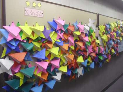 2階フロアの掲示板に飾られた「天の川」が、願いごとの星でいっぱいになりました。明日の七夕の天気は、台風の影響がありそうですが、子どもたちが書いた願いごとは、叶うように祈りましょう。