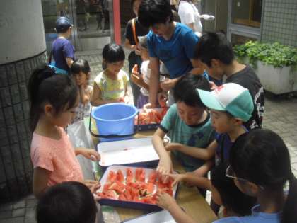 就学前の小さなお子さんたちも、お母さんといっしょに参加してくれました。冷たいスイカがおいしそうです。