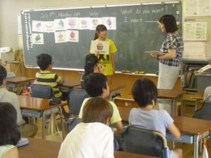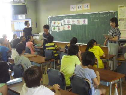2組の4時間目は、英語支援員と担任による外国語活動の時間です。担任と支援員とがやりとしながら、英語のカードを使って授業が進められていました。子どもたちは、積極的に手を挙げてみんなの前に出て発表します。英語に触れる時間が増えて、子どもたちもどんどん意欲的になっています。