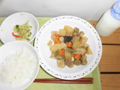 「ごはん、炒り鶏煮、野菜のレモン醤油かけ、牛乳」です。