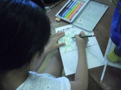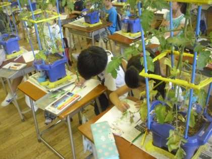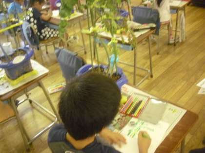 5校時の1組は、生活科の学習でミニトマトの観察です。大事に育てているミニトマトに、青い実がつき始めました。その様子をカードに記録します。まだ小さい実ですが、子どもたちはうれしそうに眺めながら、カードにまとめていました。