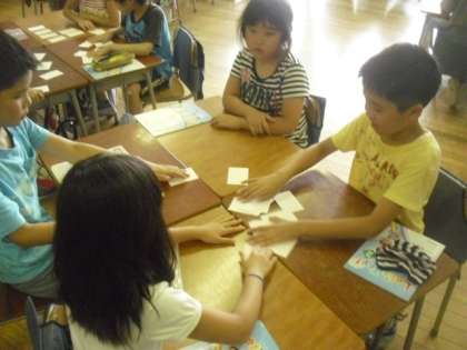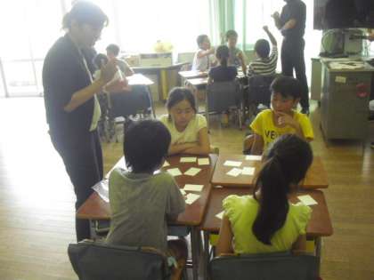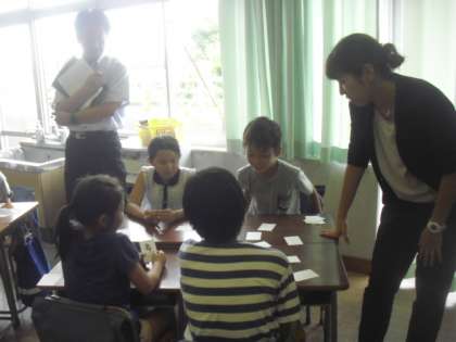 先生が一つ一つの指示をシンプルに、分かりやすく出すことで、子どもたちに英語活動への抵抗感をなくしていきます。ミニゲームなども盛り込み、必然的に英語を使う状況を作り出すことで、子どもたちが気軽に英語に親しめるような工夫を随所に盛り込んでいました。