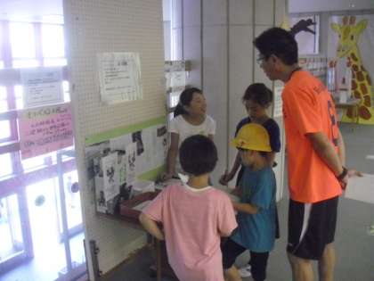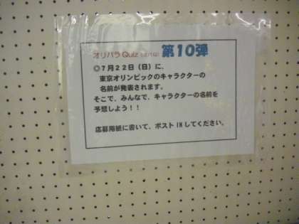 久しぶりのオリパラクイズの第10弾は、7月22日に発表になる、2020東京オリンピックのキャラクターの名前を予想する問題です。赤と青、それぞれの名前を書いて投票します。2階のフロアには、子どもたちが投票用紙を前に悩んでいました。予想する問題なので、なかなか正解は出ないかもしれませんが、22日の発表をお楽しみに。