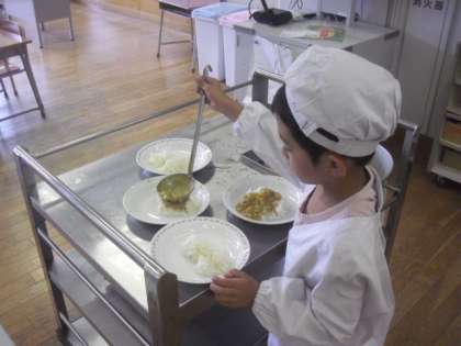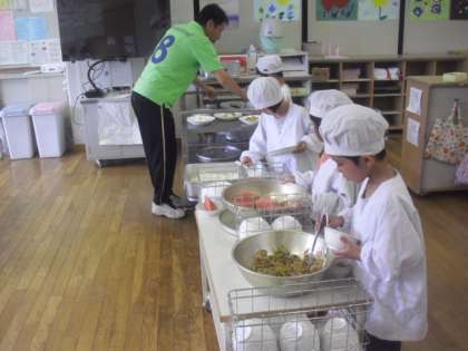 今日は1学期最後の給食です。最終日は、みんなの大好きなカレーライスです。1年生の教室では、先生のお手伝いをほとんど受けずに、子どもたちだけで配膳の用意をしていました。待っている子どもたちも、静かに座っています。こんなところにも、1年生の成長が感じられます。
