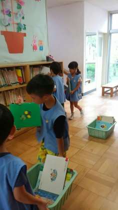 子どもたちは、絵本を玄関の本棚に戻したり、雑巾を絞っておもちゃや椅子を拭いたりと、分かれて仕事をしていました。