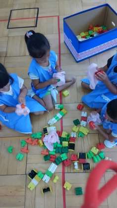 年少組さんも、大掃除に取りかかりました。雑巾で、おもちゃやブロックを磨いています。皆でやると、大掃除も楽しいな!
