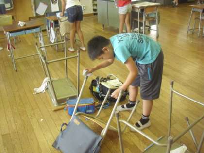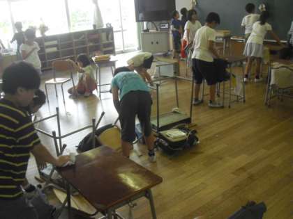 4校時は、それぞれのクラスで大掃除が行われていました。4年1組と2組では、机を移動させて、床の掃除と自分の使っている机の脚の掃除もしました。この1学期の汚れをすっきりきれいにして、2学期も気持ちよく勉強ができるようにしましょうね。