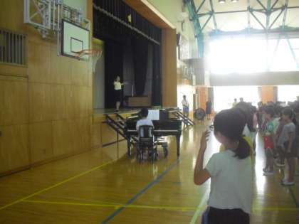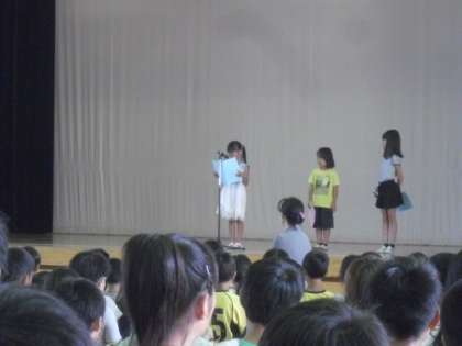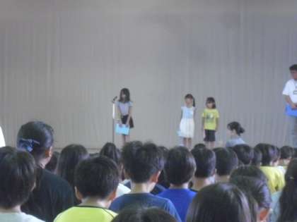 児童代表の言葉は、1年生2人と5年生の児童が、1学期の活動をふり返り、元気に発表しました。全校児童の前で、1年生も堂々とお話ができてました。校歌斉唱では、5年生のピアノの伴奏で、全員で校歌を歌いました。