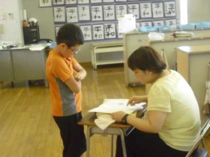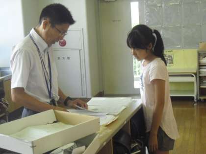 先生はそれぞれの子どもたちのがんばったところを認め、笑顔で2学期に向けての励ましの声かけをします。子どもたちも自然と笑顔になって、うれしそうにもらった通知表をながめていました。