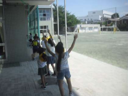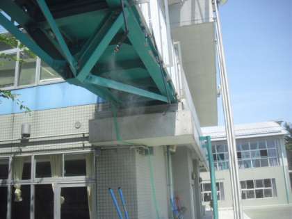 今年も、主事さん方によって2階通路にチューブを取り付けてできているミストシャワーが設置されました。校庭で遊ぶ子どもたりも大喜びです。シャワーの水量は少ないですが、この猛暑にちょっとした「涼」が感じられます。