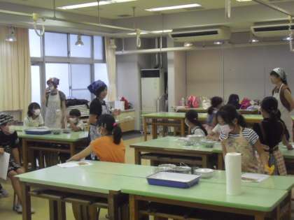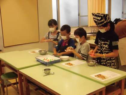家庭科室では、料理を専門とする保護者の方を講師にしたスイーツ作りに挑戦します。カラフルな白玉ポンチと白玉だんごを作ります。希望者も多かった大人気の講座で、参加した子どもたちは、始まる前からニコニコ笑顔が絶えませんでした。
