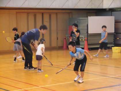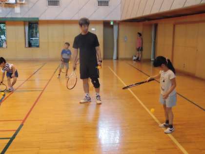 午前の部の7つ目は、地域体育館を使ってのショートテニスです。保護者の佐藤さんを講師に、毎年人気のある講座です。本校から小林教諭も参加し、子どもたちはショートテニスの基本から教わりました。