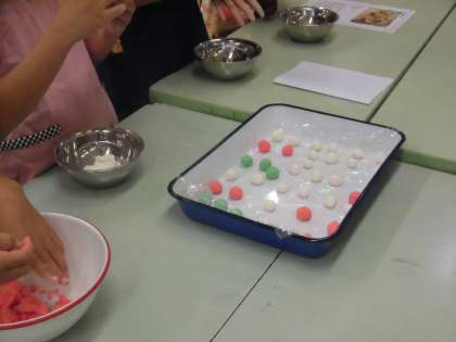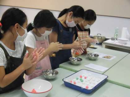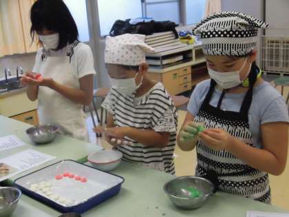 白玉作りに挑戦中です。手でコロコロと丸めて、カラフルな楽しいスイーツになりそうです。