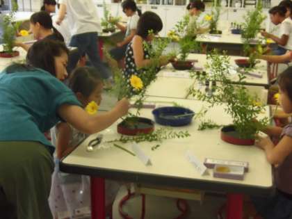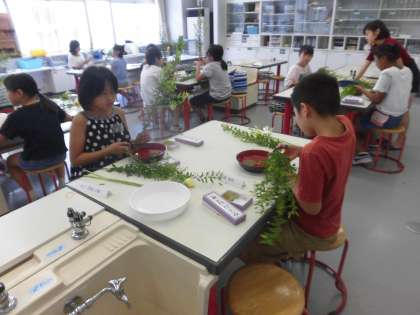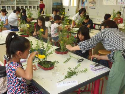 お花の生け方の基本を教わり、いろいろと試行錯誤しています。ここでも、お手伝いの方々の助言をいただき、子どもたちは自分の発想を大事にしながらチャレンジできていました。