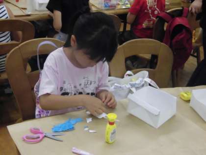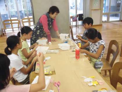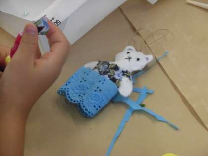 小物作りは、フェルトのクマさん作りに入ります。かわいい服を着せて完成です。