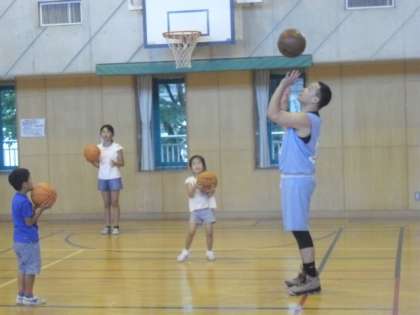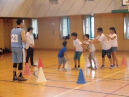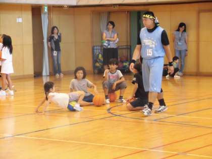 まずは、ボールに慣れることから始めます。その後で、楽しくフットワークを身につける練習をしました。