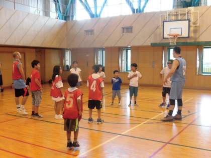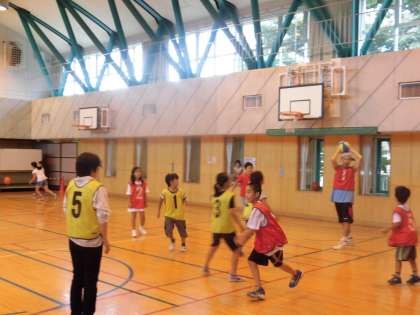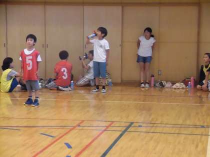 次に、ドリブルをせずにパスだけでボールを回すゲームをしました。チームで声をかけ合いながら、プレーします。ボールだけでなく、仲間の動きを見ながらコートを走り回りました。こまめに水分補給も欠かさず行いました。