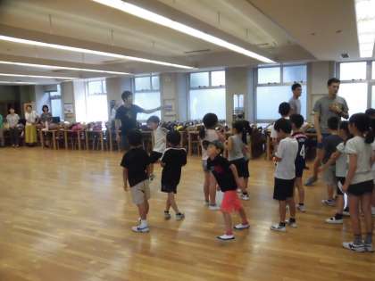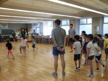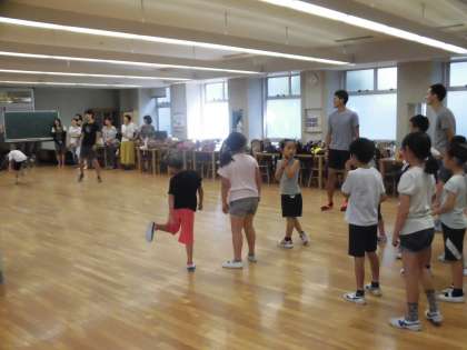 午後の運動系の講座は、「目指せかけっこ一等賞」。日本大学陸上部の現役の選手を講師に、走り方のコツを教わります。この暑さで熱中症が心配されることから、まずは涼しいランチルームでストレッチ、ウォーミングアップをしました。